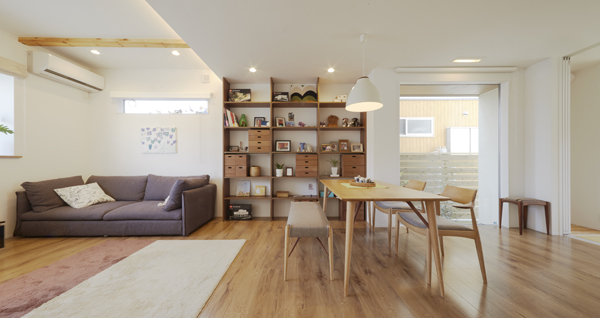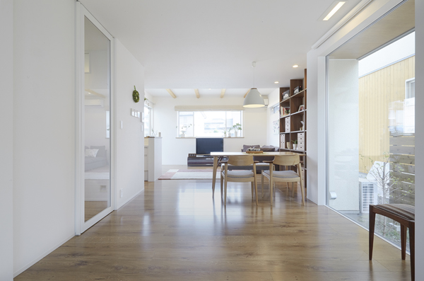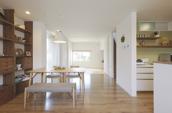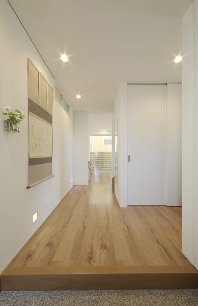 小さなギャラリーコーナーを持つ玄関からはキッチン、リビング、和室と連続した動線でさまざまなシーンと広がりを展開しています。