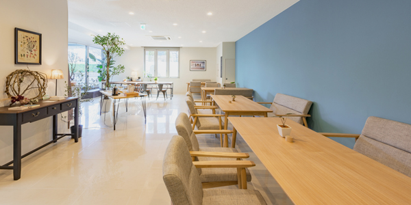 サロン部分は客席にゆとりを持たせており、壁面の一部にブルー系を採用することで心を落ち着かせ、ゆったりした空間の中でお茶を楽しむことができます。