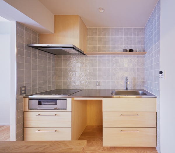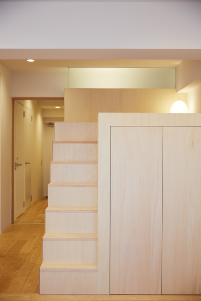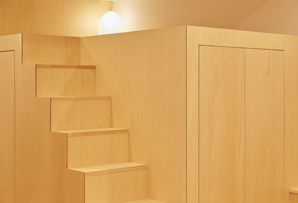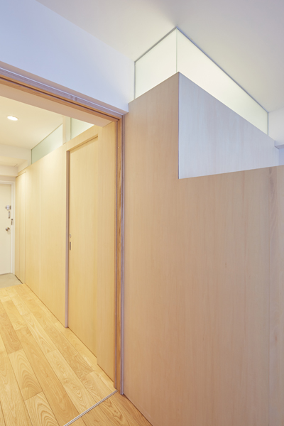 そのロフトに隣接した洗面と浴室の壁の上部には、欄間状に明かり取りのためのガラスを設け、空間の連続性と人の気配を感じることができ、部屋の奥まで明るさが行き届きます。